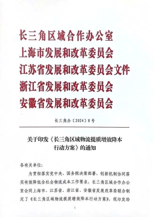 為貫徹落實黨中央、國務(wù)院決策部署,創(chuàng)新機(jī)制協(xié)同落實國家層面有效降低全社會物流成本工作要求,推動降低長三角區(qū)域物流成本、提高經(jīng)濟(jì)運(yùn)行效率,長三角區(qū)域合作辦公室、上海市發(fā)展改革委、江蘇省發(fā)展改革委、浙江省發(fā)展改革委、安徽省發(fā)展改革委聯(lián)合印發(fā)《長三角區(qū)域物流提質(zhì)增效降本行動方案》,明確了7方面37項具體舉措。