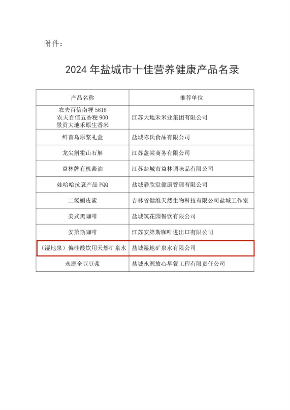 近日,鹽城市十佳營養(yǎng)健康產(chǎn)品評(píng)選結(jié)果出爐,鹽城濕地礦泉水有限公司“濕地泉”系列偏硅酸飲用天然礦泉水榮獲2024年鹽城市十佳營養(yǎng)健康產(chǎn)品稱號(hào)。