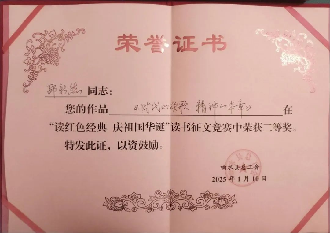近日,由響水縣總工會舉辦的2024年度“讀紅色經(jīng)典、慶祖國華誕”職工讀書征文競賽活動結(jié)果相繼公布,江蘇響水港物流有限公司業(yè)務(wù)組邵新然的《時代的頌歌,精神的華章》在眾多作品中脫穎而出,榮獲征文競賽二等獎。