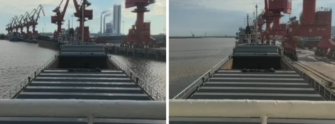 為確保船舶能夠在無(wú)拖輪的情況下安全靠港,引航員在充分結(jié)合碼頭的生產(chǎn)調(diào)度現(xiàn)狀的基礎(chǔ)上,根據(jù)引航手持設(shè)備,直觀水文條件與航道情況,為避免低平潮淺水效應(yīng),根據(jù)船舶特性,利用風(fēng)流壓與車(chē)、舵、錨、纜相結(jié)合,采用拋錨拉大角度船頭靠泊的方式進(jìn)港,在引航員精湛的技藝之下,船尾與泊位周邊浮筒擦肩而過(guò),完美地進(jìn)入碼頭范圍。在主控室中,不斷下達(dá)車(chē)速與舵角的操作指令,在湍急的岸邊水流中不斷拉扯船舶與碼頭的位置,最終在碼頭工人拉緊最后一根纜繩的同時(shí)完成本次靠港任務(wù)。