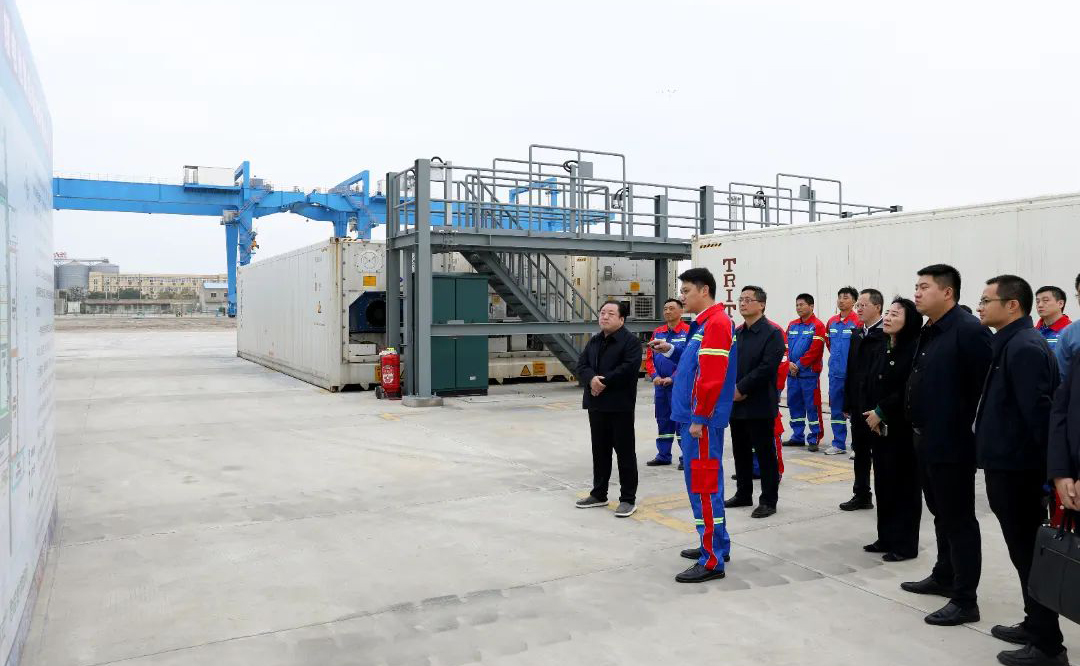 調(diào)研后,周正雄在自動(dòng)化集裝箱堆場(chǎng)召開座談會(huì)議。