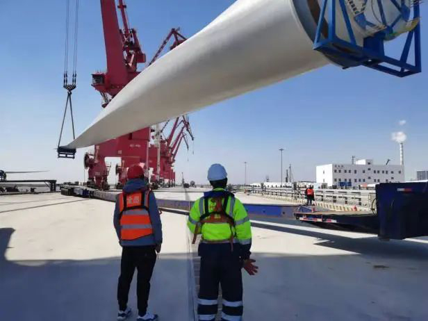 近日,隨著射陽港區(qū)第二班組指揮員的一句“好,可以往下繼續(xù)放”,自重40噸的大功率海上風(fēng)電葉片,從港區(qū)3.5萬噸級碼頭1號泊位平穩(wěn)吊放在振興5的船舶甲板??粗L(fēng)電葉片平穩(wěn)下落,現(xiàn)場作業(yè)人員都不由自主地鼓起掌來,這是港區(qū)首次自主成功裝卸單機(jī)葉片長度超過99米的7兆瓦風(fēng)電葉片,也正式標(biāo)志著射陽港區(qū)已完全具備自主裝卸大型風(fēng)電葉片的能力。