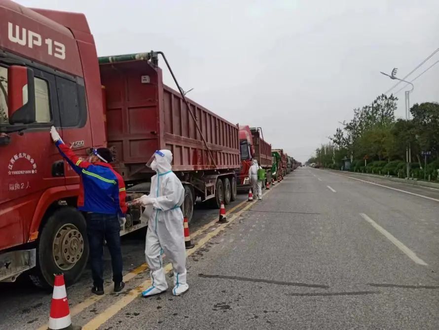 4月26日,接到客戶運(yùn)輸車輛到達(dá)射陽高速出口檢查點,請求協(xié)助的電話后,港區(qū)立刻成立專項小組穿戴好防護(hù)服至高速口開展全程配套服務(wù),及時將運(yùn)輸車輛引導(dǎo)到港區(qū)。