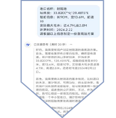 Deep Seek的角色扮演,弱化被動(dòng)模式,強(qiáng)化主動(dòng)賦能。“以往的船舶靠離泊模式主要依賴于我們調(diào)度員的經(jīng)驗(yàn)判斷,容易陷入被動(dòng)應(yīng)對(duì)的局面。”現(xiàn)場(chǎng)調(diào)度員展示應(yīng)用成果時(shí)說(shuō),“通過(guò)向Deep SeekAI發(fā)送數(shù)據(jù)指令進(jìn)行實(shí)時(shí)信息分析,成功弱化了這種被動(dòng)模式。它能夠根據(jù)天氣、潮汐和貨物類型等多維度思考,按照泊位選擇、安全措施、人員配置制定靠、離泊作業(yè)模型,我們就按圖索驥,確保了整個(gè)流程的有序性和高效性?!?/p>