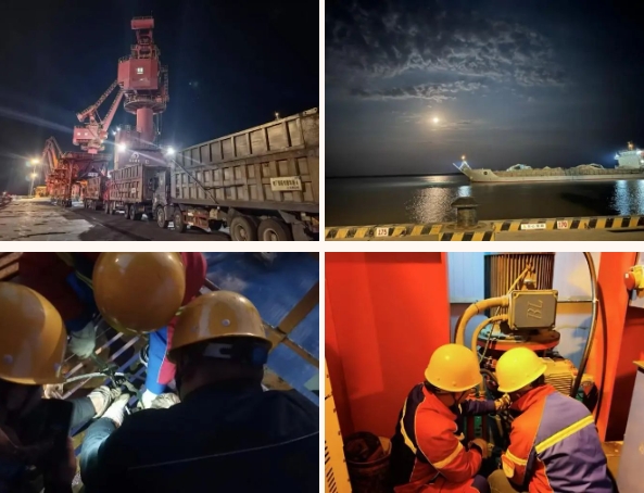 星斗轉(zhuǎn)移間,港區(qū)燈火織就金色蛛網(wǎng)。維保員謝凱登上7#門機,在操作司機進行作業(yè)前試運行時,由下而上逐項檢查“四大機構(gòu)”各鉸點工況,這個已經(jīng)從業(yè)達十年的“設(shè)備醫(yī)生”,各個異常部件,都逃不過他的“聽診”;此刻,碼頭上4臺門機、16輛短駁車輛正接受作業(yè)前深度“體檢”,設(shè)備完好率99.9%的紀錄在月光下悄然刷新;遠處傳來貨輪悠長的汽笛,現(xiàn)場調(diào)度員使用高頻指揮著船舶乘潮進港,用精準、精致將潮汐、貨種、作業(yè)效能編織成最優(yōu)解的算式。
