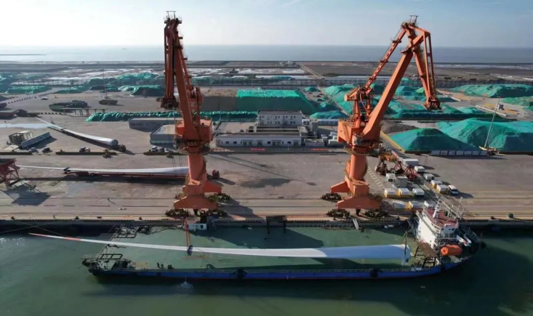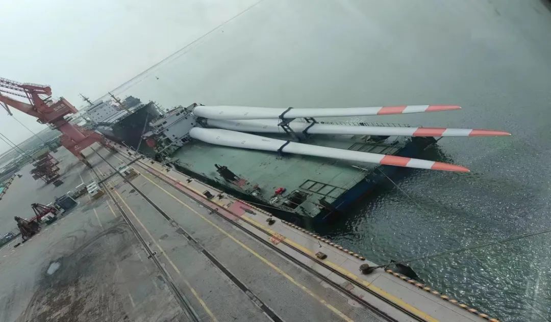 國電投山東海陽項目首套風(fēng)電設(shè)備系濱海港建港以來進(jìn)港海運最大的風(fēng)力葉片,全長97米。此次運載的風(fēng)力葉片從南通運至濱海港區(qū)碼頭,由于該葉片體身長,運輸過程中涉及安全系數(shù)較大,為確保萬無一失,從327省道轉(zhuǎn)入濱海港區(qū)后,生產(chǎn)經(jīng)營條線安排專班人員實時跟蹤服務(wù),及時協(xié)調(diào)清理影響拐彎的部分隔離護(hù)欄,保障途中各轉(zhuǎn)彎要道口的通行安全,順利抵達(dá)目的地——濱海港碼頭1號泊位。至此,三根風(fēng)葉片全部被安全高效地裝載上貨輪,運往國電投山東海陽目的地。