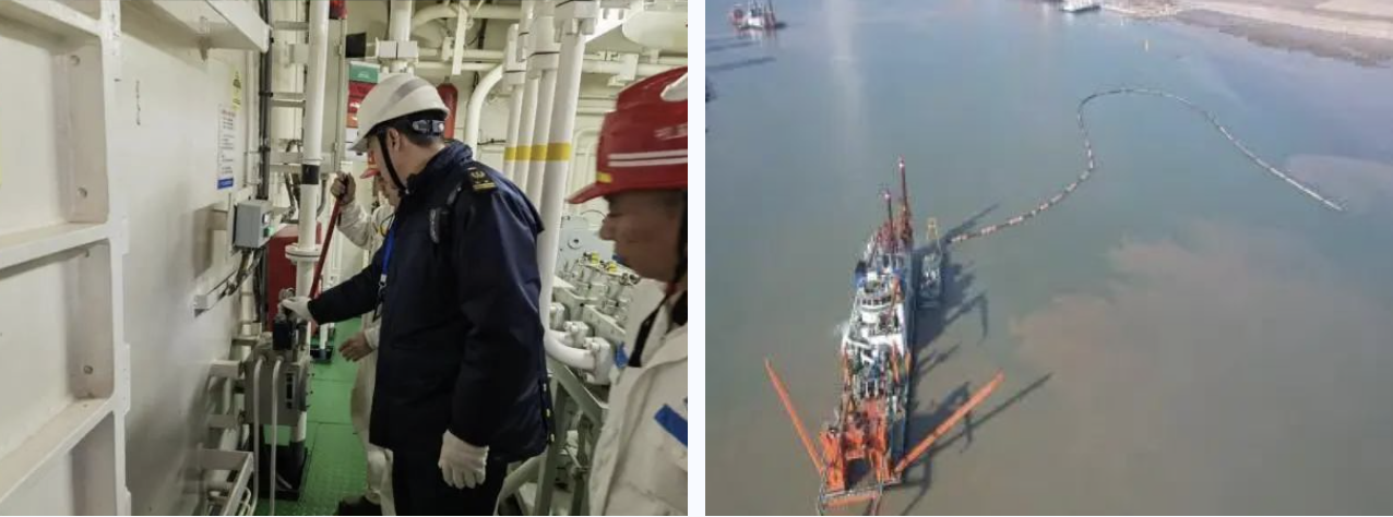 受季節(jié)性回淤影響,當(dāng)前港池內(nèi)水深難以保障大型船舶進(jìn)出港口通航。聞此訊息,濱海港區(qū)及時(shí)制定詳細(xì)施工方案和安全生產(chǎn)防范要點(diǎn),組織拼接浮管并協(xié)調(diào)絞吸船“新海豚”從梅山調(diào)遣至濱海港海域場(chǎng)地,面對(duì)工期緊、現(xiàn)場(chǎng)船舶密度大、寒潮大風(fēng)等惡劣天氣的影響,他們搶節(jié)點(diǎn),抓進(jìn)度,分秒必爭(zhēng)完成倒樁、封艙、船檢、解封、項(xiàng)目交底、海事安檢等工作,高質(zhì)量推進(jìn)主港池清淤工程快速、穩(wěn)健的完成。