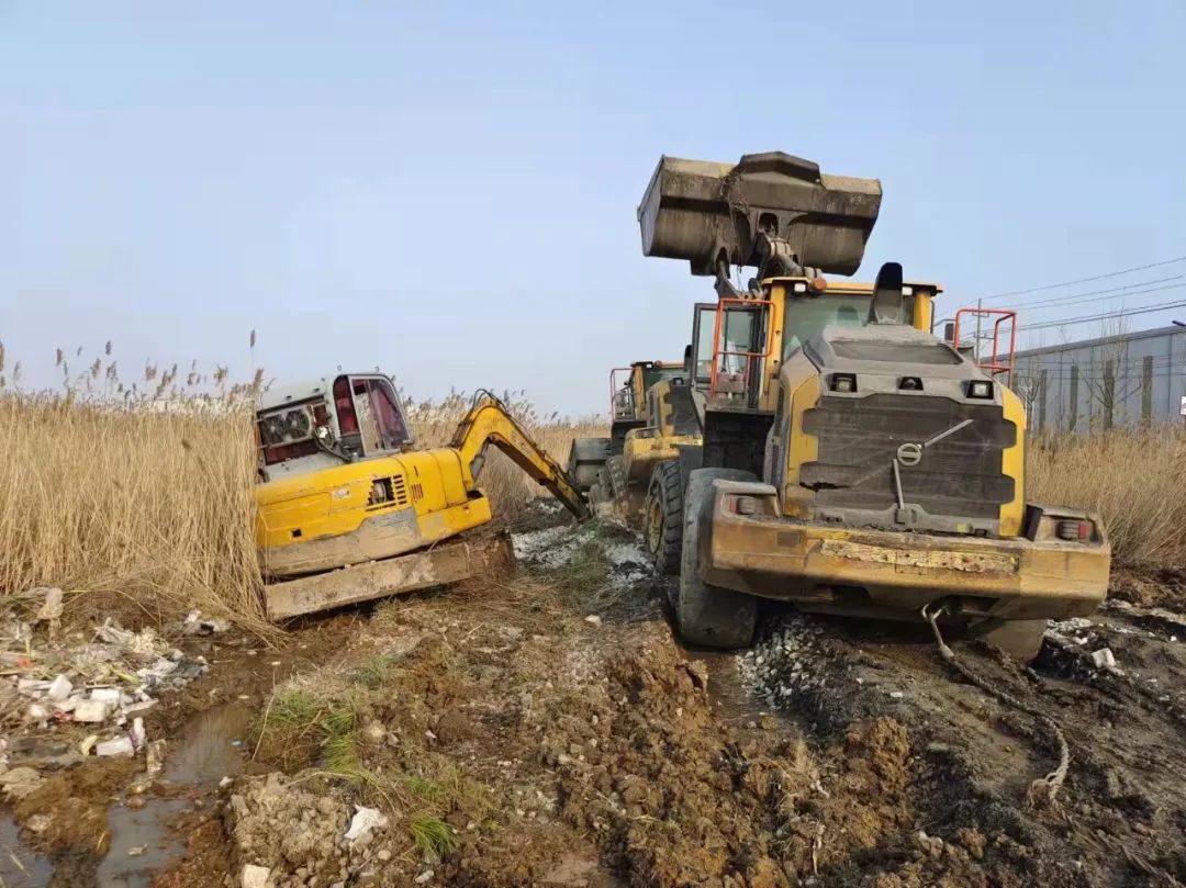 面對連續(xù)的失敗,響水港區(qū)團隊再次展現出了百折不撓,迎難而上的港口工匠精神,深刻剖析前兩次失敗原因,再次調集一臺小型挖機對事件車輛輪子周邊淤泥進行清理,回填石子提升其自身摩擦力,同時針對涉險裝載機陷入太深可能造成底盤擱置等情況,調配一輛裝載機協(xié)助抬升予以解決,并再次調集一輛裝載機采用接力模式增加牽引力。經過多臺機械的通力配合,受困裝載機終于在拖拽中緩緩駛出泥潭,圓滿完成救援工作。