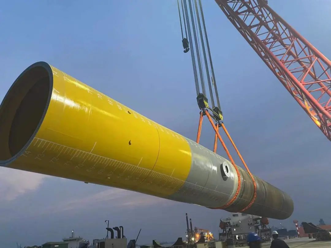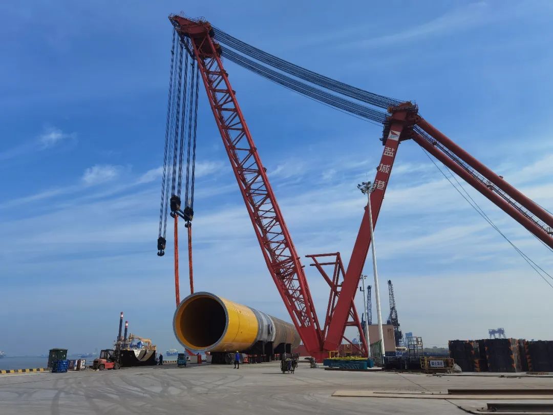 5月28日,鹽城港響水港區(qū)小蟒牛作業(yè)區(qū)公用重件碼頭現(xiàn)場(chǎng)一派繁忙景象,由公用重件碼頭后方陸域打砂除銹噴涂并進(jìn)行拼接組裝的首件風(fēng)電樁基,通過自行模塊車運(yùn)輸至碼頭前沿。該件總長(zhǎng)75米、直徑8米、總重達(dá)1055.1噸,由1100t-51m巨無霸固定桅桿吊穩(wěn)穩(wěn)吊起,緩緩地放置在駁船擱置梁上,出海駛向渤海風(fēng)電建設(shè)現(xiàn)場(chǎng)。