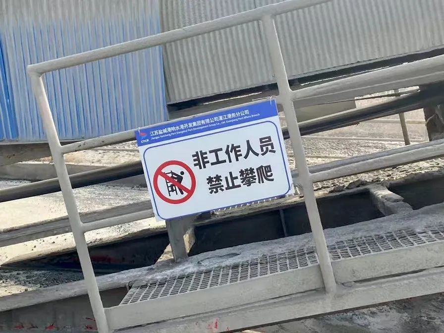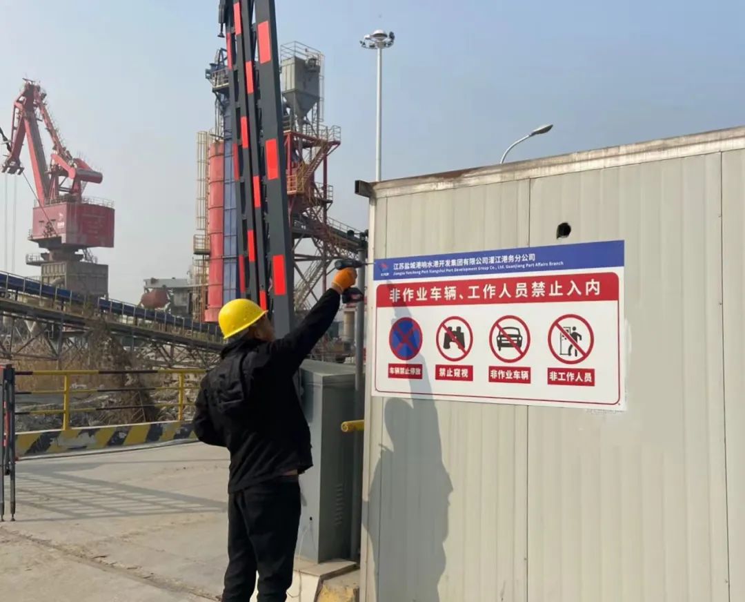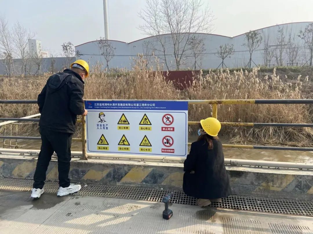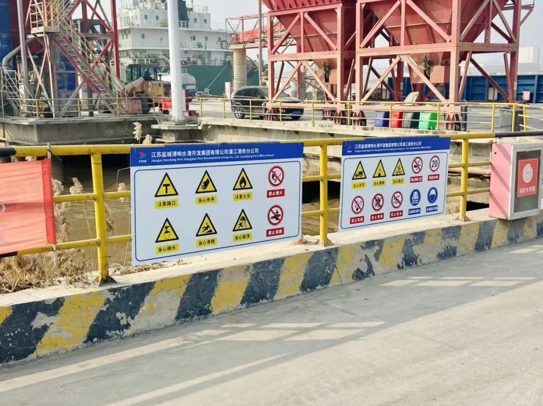 在港區(qū)門閘處設(shè)置“非作業(yè)車輛、工作人員禁止入內(nèi)”標(biāo)識,提示社會人員、車輛不要誤闖誤入港區(qū)。在引橋欄桿上懸掛“注意路口,當(dāng)心貨車”“禁止酒后上崗,必須戴安全帽”等標(biāo)識,提醒工作人員注意自身安全,嚴(yán)肅上崗紀(jì)律;在碼頭后沿護(hù)欄上懸掛“禁止翻越”“水深危險,禁止靠近”,警示工作人員不要翻越碼頭護(hù)欄,遠(yuǎn)離危險水域。本次完善新增警示標(biāo)識牌共十余塊。
