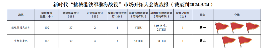 自新時代“鹽城港鐵軍淮海戰(zhàn)役”市場開拓大會戰(zhàn)開展以來,航運集團積極響應鹽城港集團黨委號召,成立航運集團突擊隊和巾幗突擊隊,持續(xù)深化攬貨拓源,大力弘揚“鐵軍精神”,成功實現(xiàn)市場開拓“新突破”,將定制化、兜底式服務推向了“新高度”。截至目前,累計拜訪客戶308家,簽訂意向協(xié)議97份,簽訂正式協(xié)議8份,實現(xiàn)新增營收超100萬元,集裝箱走量1008TEU。根據(jù)新時代“鹽城港鐵軍淮海戰(zhàn)役”指揮部第二期戰(zhàn)報,航運集團包攬集體前兩名,個人前三名,全力打響“鹽城港鐵軍淮海戰(zhàn)役”市場開拓大會戰(zhàn)第一槍。