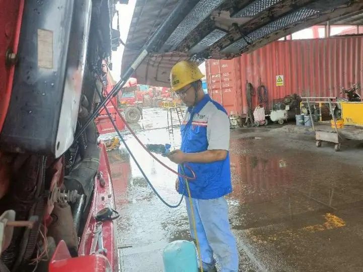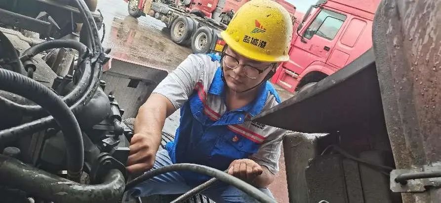 連續(xù)的高溫,讓穿梭于碼頭與堆場的車輛,也會受不住“中暑生病”,出現(xiàn)散熱不暢、空調(diào)不制冷、控制器高溫等故障。為保證碼頭的正常運營,陸晨不顧已超40℃的體感溫度,戴上工作手套,拿著他的工具箱,打開已達(dá)60℃的發(fā)動機,用手觸摸每一個部件來尋找“癥結(jié)”。汗水不斷滑下,工作服也因汗水而浸濕,緊緊貼在身上,但陸晨全然不顧,只一心一意、專心致志為集卡車“把脈問診”。高溫下的時間總是顯得很緩慢,陸晨擦了檫臉上的汗笑著說:“我工作10年了,剛開始也不適應(yīng),但因為喜歡車,慢慢也就習(xí)慣了?!标懗拷榻B,除發(fā)動機外,在密閉駕駛室內(nèi)檢修,也是一大考驗。車廂外40℃左右的高溫,駕駛室內(nèi)則完全密閉,很多人是受不了的。“任何一臺集卡車都離不開我們修理工。”陸晨說,“我的任務(wù)就是盡自己最大努力修理車輛,保證碼頭的正常運轉(zhuǎn)”。