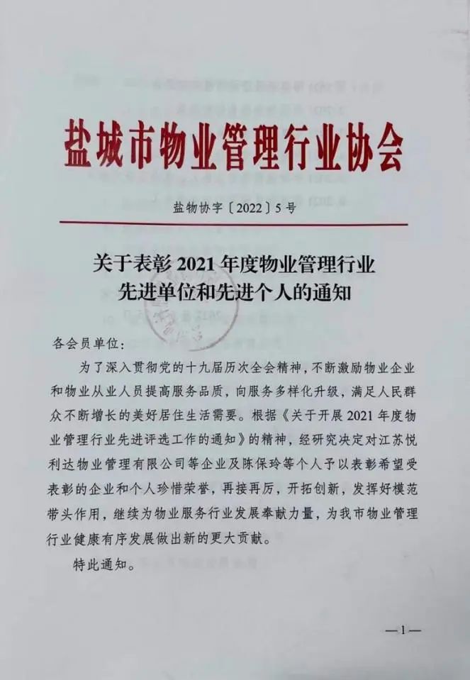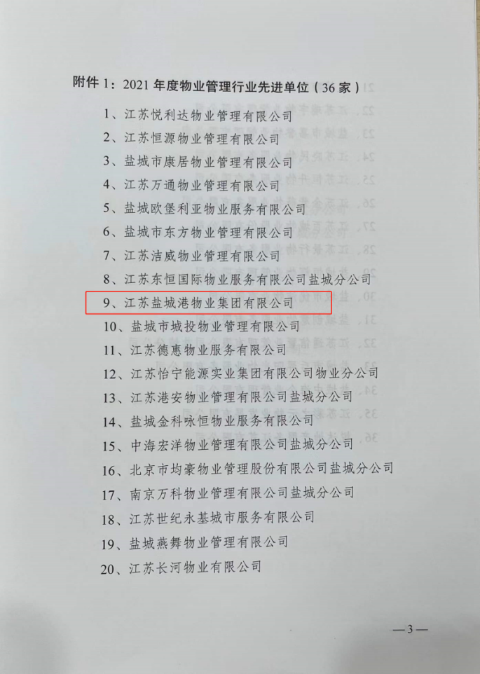 近日,鹽城市物業(yè)管理行業(yè)協(xié)會對全市物業(yè)管理行業(yè)先進(jìn)單位和先進(jìn)個人進(jìn)行了表彰,江蘇鹽城港物業(yè)集團(tuán)有限公司獲評“2021年度物業(yè)管理行業(yè)先進(jìn)單位”榮譽稱號。