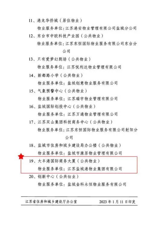近日,江蘇省住房和城鄉(xiāng)建設廳公布2021年度省級示范物業(yè)管理項目名單,“鹽城港大豐港國際商務大廈(公共物業(yè))”被評價為“2021年度省級示范物業(yè)管理項目”,該項目由鹽城港物業(yè)集團有限公司提供管理服務,該榮譽是江蘇省物業(yè)管理行業(yè)省級最高榮譽。