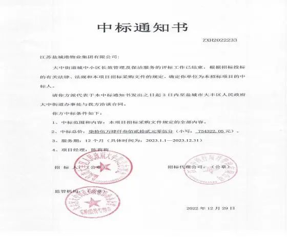 拓市場,保增長,項目業(yè)績創(chuàng)一流。實業(yè)集團在提升物業(yè)服務(wù)質(zhì)量、房屋租賃水平,擴大鹽城港集團“內(nèi)循環(huán)”的同時,逐步向外部市場拓展。1月,黃海港城公司與中天大豐電纜有限公司成功簽訂員工宿舍租賃存量住宅業(yè)務(wù)合同,合同金額近30萬元。物業(yè)公司成功中標大中街道城中小區(qū)長效管理及保潔服務(wù),中標價約75萬元。