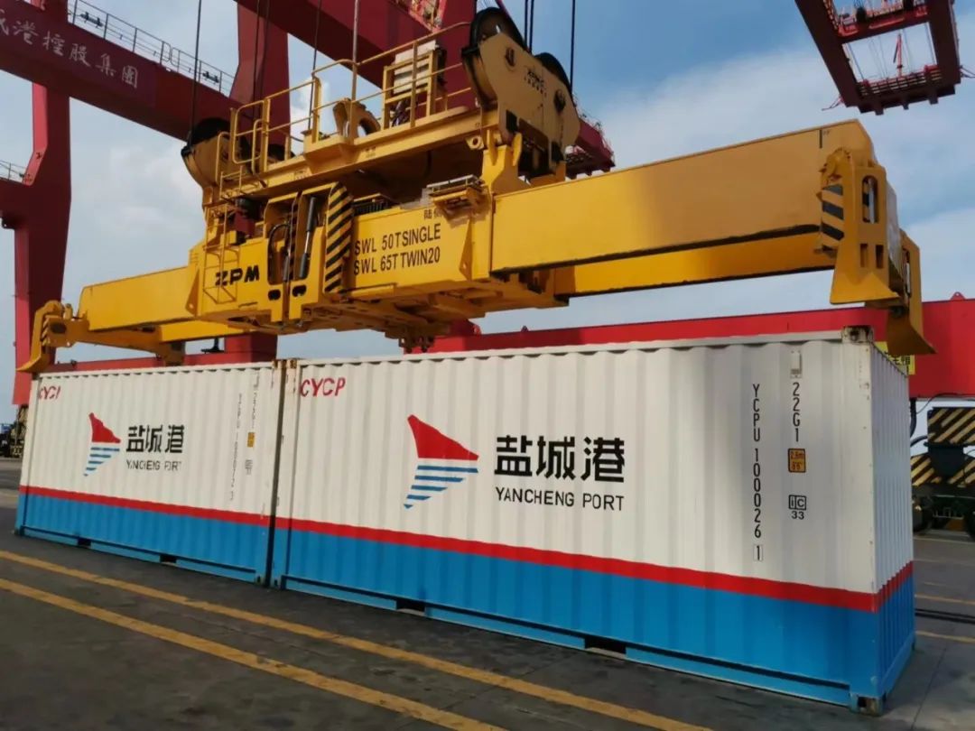 近日,鹽城港大豐港區(qū)第一作業(yè)區(qū)雙箱吊具經(jīng)升級(jí)改造后,完成初步運(yùn)行調(diào)試。