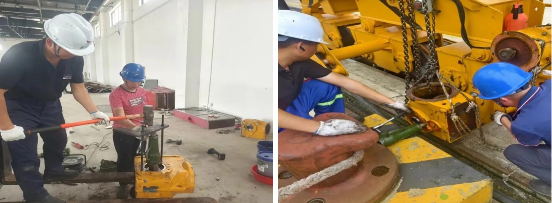 一線現(xiàn)場(chǎng),總能看到港機(jī)公司維保人員忙碌的身影。在接到建湖港區(qū)的龍門(mén)吊行走減速箱出現(xiàn)故障,需要對(duì)設(shè)備進(jìn)行緊急檢修的任務(wù)后,他們迅速到場(chǎng)排查出故障原因,手持工具邊拆卸邊檢修,盡管揮汗如雨,但他們絲毫不在意,用心保障著港口的每一處機(jī)械設(shè)備的運(yùn)轉(zhuǎn)。