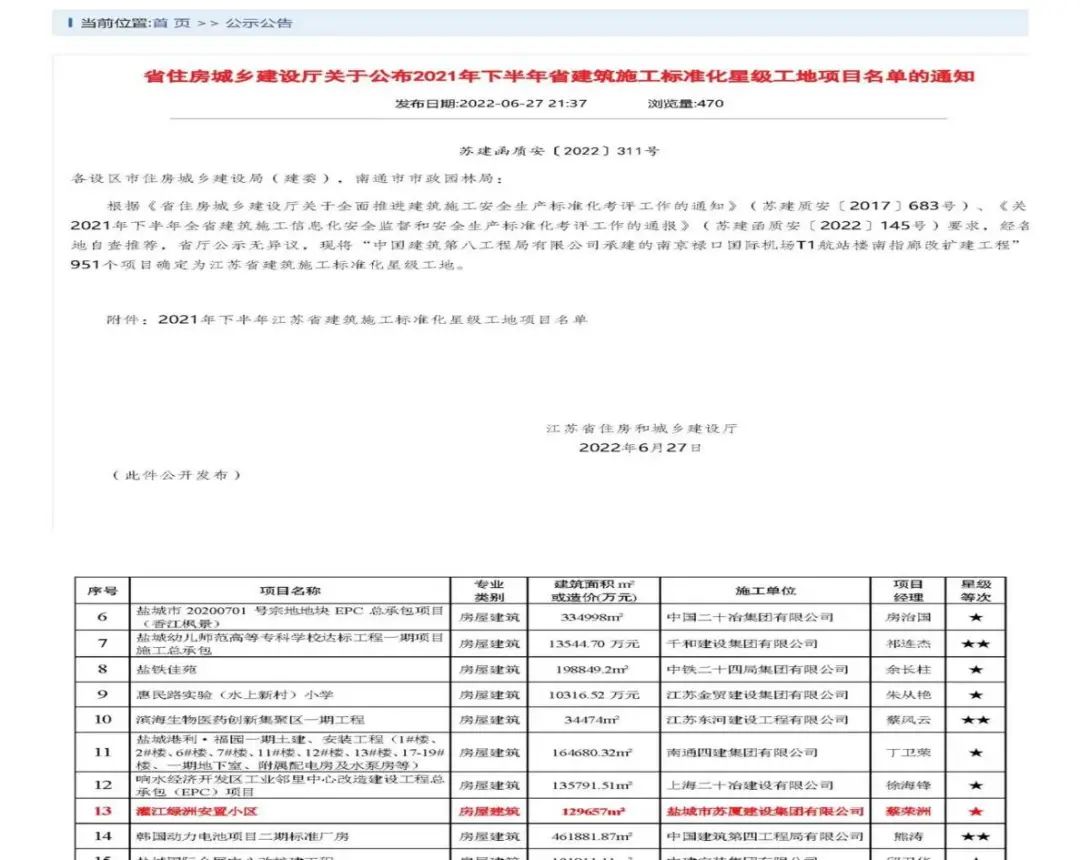 近日,鹽城港集團灌江綠洲安置小區(qū)項目在榮獲“鹽城市建筑施工標(biāo)準(zhǔn)化示范工地”稱號后,再次榮獲“2021年下半年江蘇省建筑施工標(biāo)準(zhǔn)化星級工地”稱號。