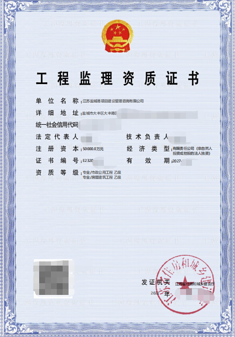 2022年11月18日,項(xiàng)目管理公司獲得由江蘇省住房和城鄉(xiāng)建設(shè)廳頒發(fā)的“房屋建筑工程乙級(jí)和市政公用工程乙級(jí)”兩項(xiàng)工程監(jiān)理資質(zhì)證書,標(biāo)志著公司資質(zhì)申辦工作取得重大進(jìn)展,對(duì)提升公司品牌影響力,提高市場(chǎng)競(jìng)爭(zhēng)力具有重要的意義。