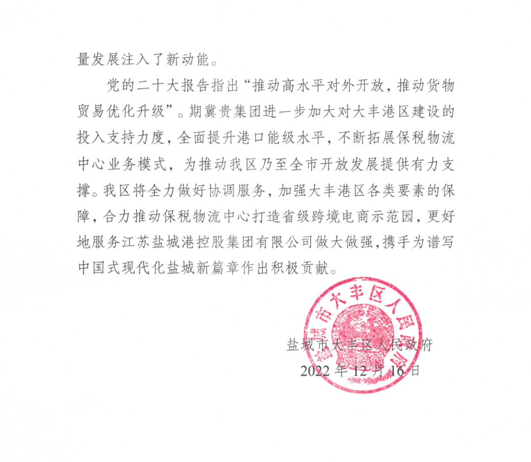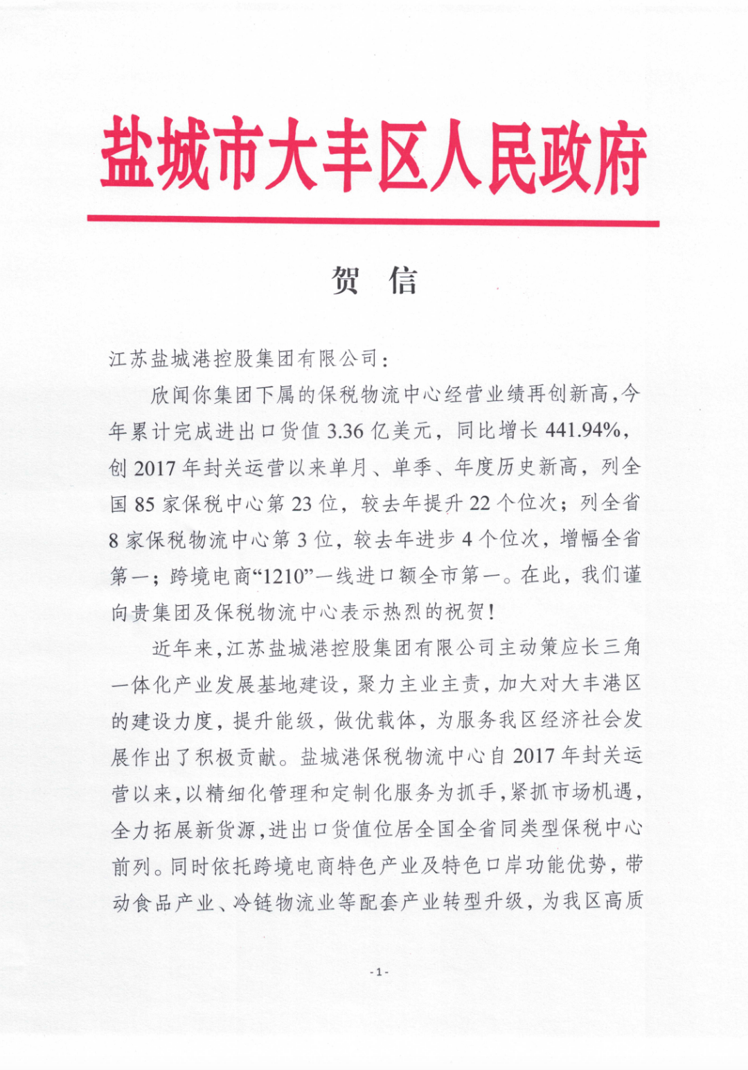 12月16日,大豐區(qū)人民政府向我集團發(fā)來賀信,對我集團下屬保稅物流中心經(jīng)營業(yè)績再創(chuàng)新高表示祝賀。