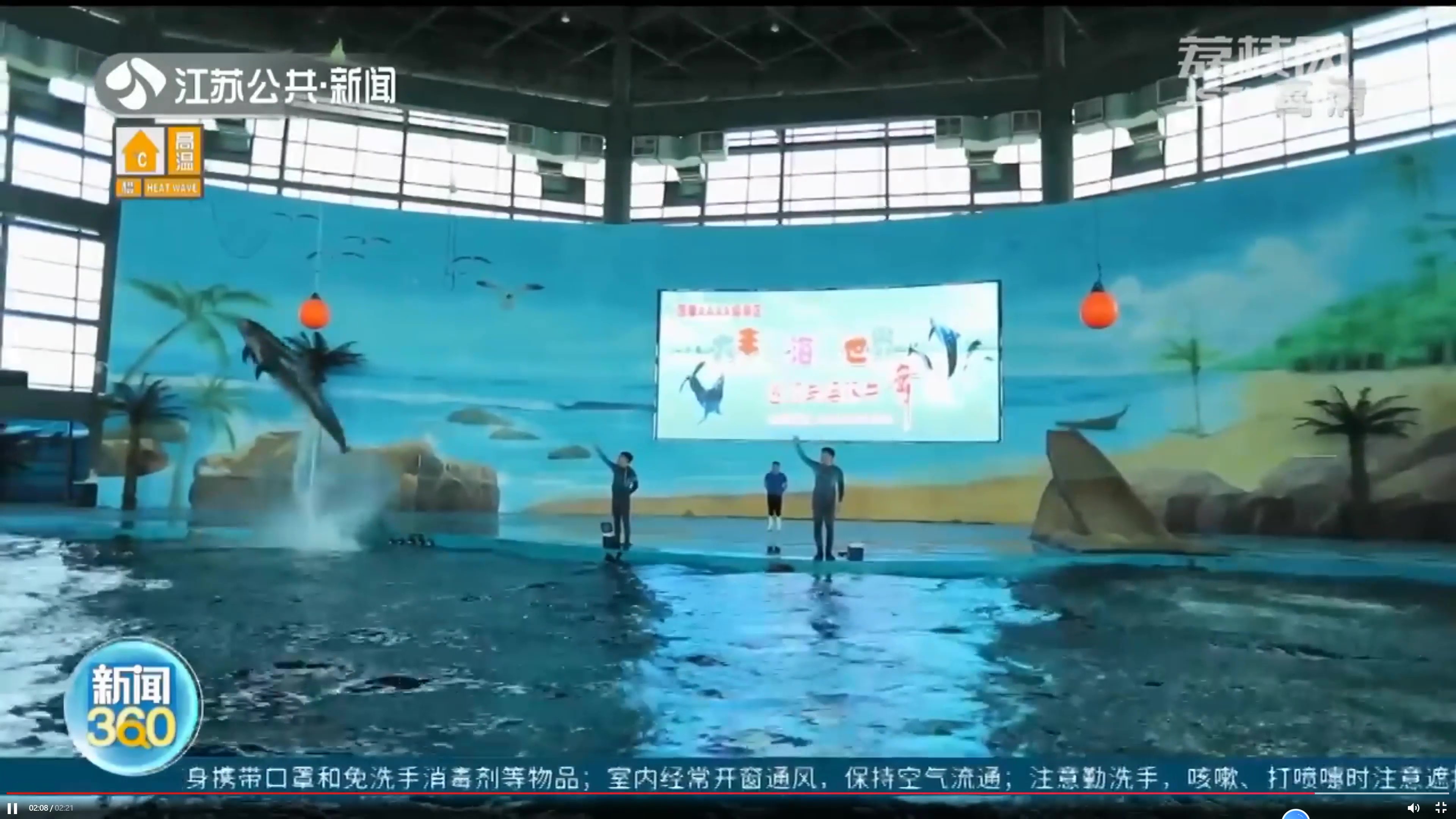 新聞中展示了鹽城港海洋館內(nèi)的馴養(yǎng)員與海豚互動(dòng)表演,馴養(yǎng)員時(shí)而騎在海豚身上,讓海豚在水池中快速滑翔,時(shí)而指揮海豚,讓海豚在水池中高高躍起擊中懸掛的氣球,憨態(tài)可掬又靈活精怪的海豚帶來的精彩表演引來現(xiàn)場(chǎng)觀眾陣陣喝彩。