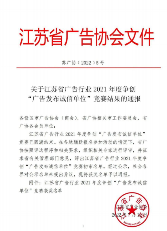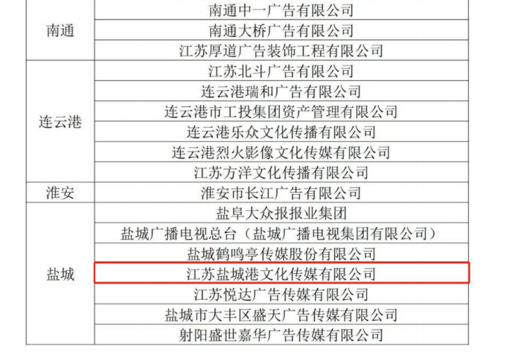 7月16日,2021年度江蘇省廣告行業(yè)廣告發(fā)布誠信單位評選結(jié)果公布,江蘇鹽城港文旅集團(tuán)文化傳媒公司再獲榮譽稱號。