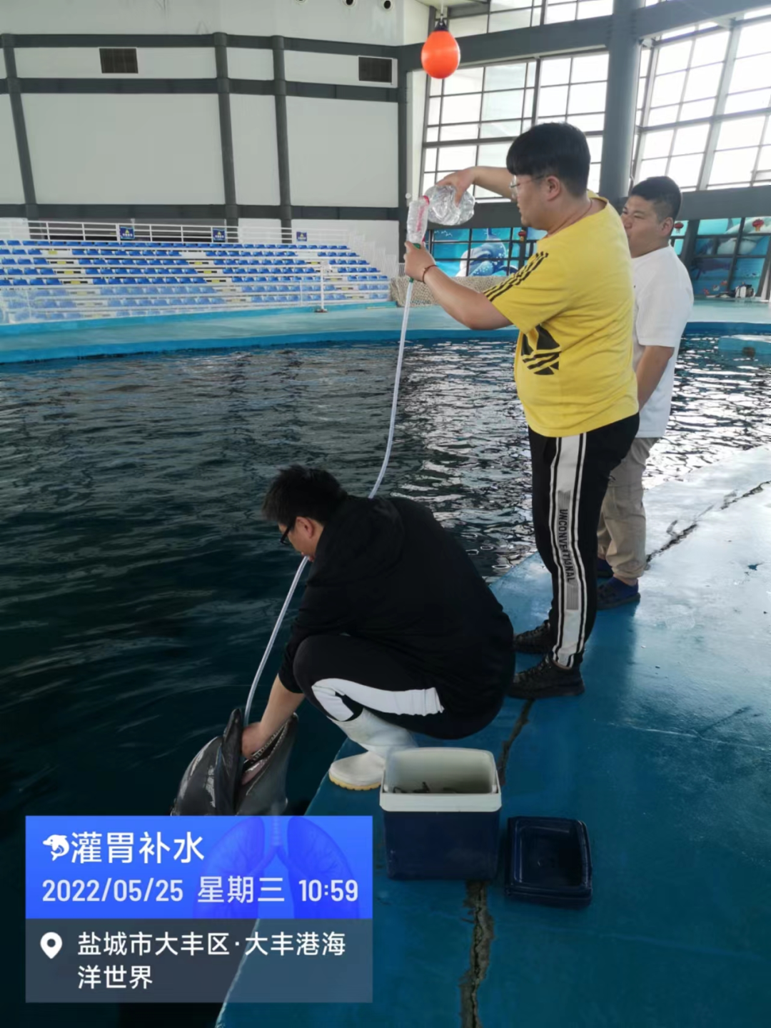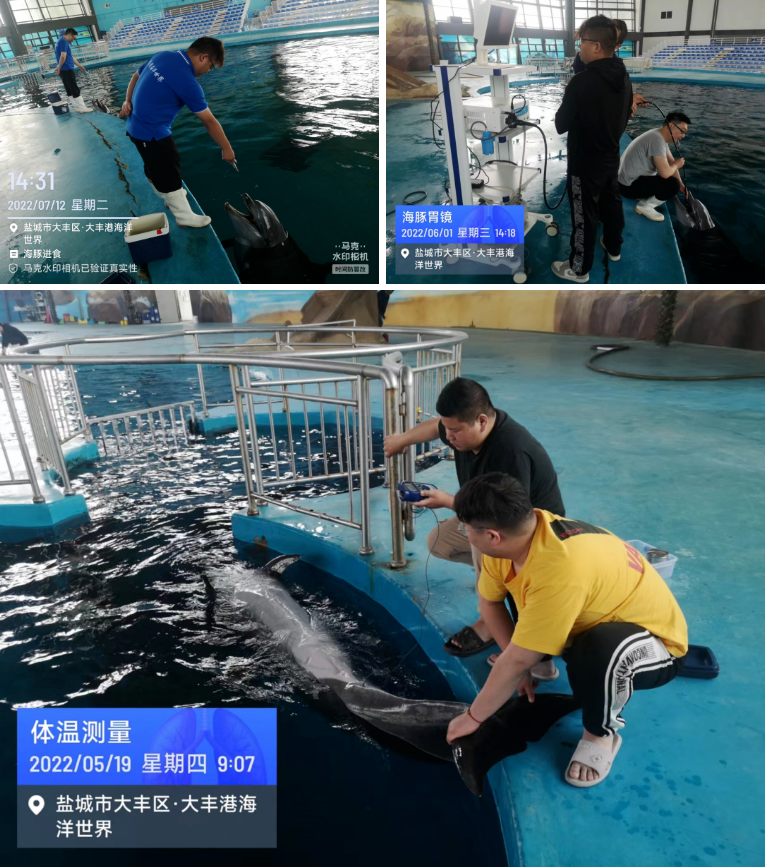 文旅集團(tuán)海洋世界所飼養(yǎng)的兩頭海豚,學(xué)名日本寬吻瓶鼻海豚,他們來大豐港區(qū)已經(jīng)生活了六年多,已充分適應(yīng)了這里的環(huán)境。在我們馴養(yǎng)團(tuán)隊的精心照料下,快樂地成長。馴養(yǎng)師每天精心準(zhǔn)備海豚寶寶喜愛吃的俄羅斯進(jìn)口的鯡魚、日本進(jìn)口的多春魚以及挪威進(jìn)口的魷魚,一個海豚的日食量達(dá)到10公斤。同時每日為其補充各種維生素。我們每天檢測他們的體溫、用插胃管的方式“飲水”。正常情況下,每月為其全面體檢一次,包括采血檢驗、胃鏡檢查、呼吸空氣采樣送檢,從而確認(rèn)他們身體處于健康狀態(tài)。