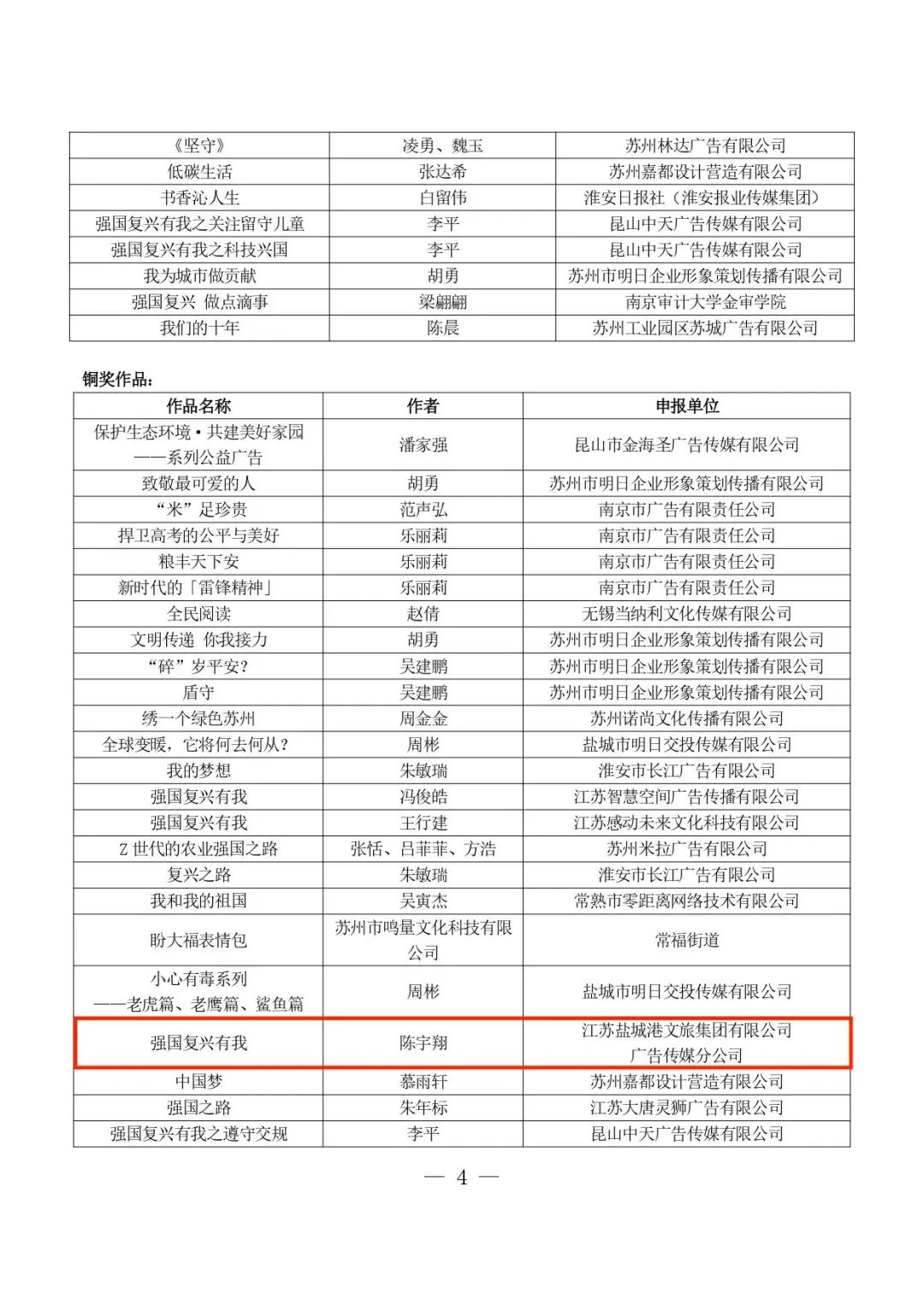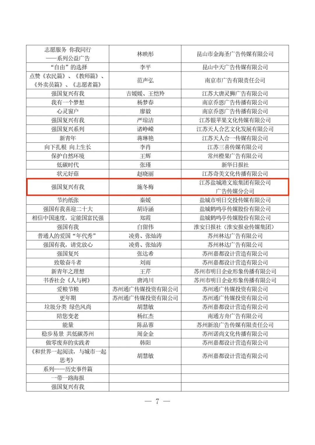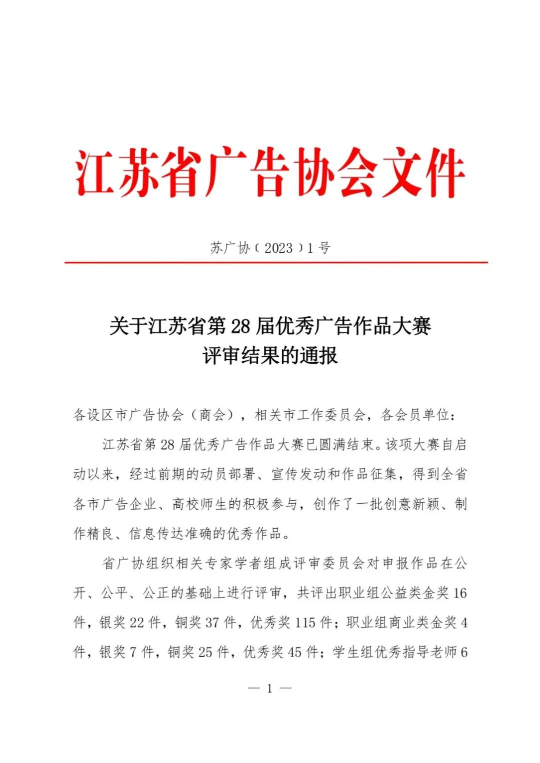 據(jù)悉,“江蘇省優(yōu)秀廣告作品大賽”由江蘇省廣告協(xié)會主辦,迄今為止已舉辦28屆,吸引了省內數(shù)百家公司參與,每屆賽事均有數(shù)千個作品參加比賽。本屆大賽,文旅集團廣告?zhèn)髅椒止緫{借過硬的專業(yè)實力榮獲職業(yè)組公益類作品銅獎和職業(yè)組公益類作品優(yōu)秀獎。
