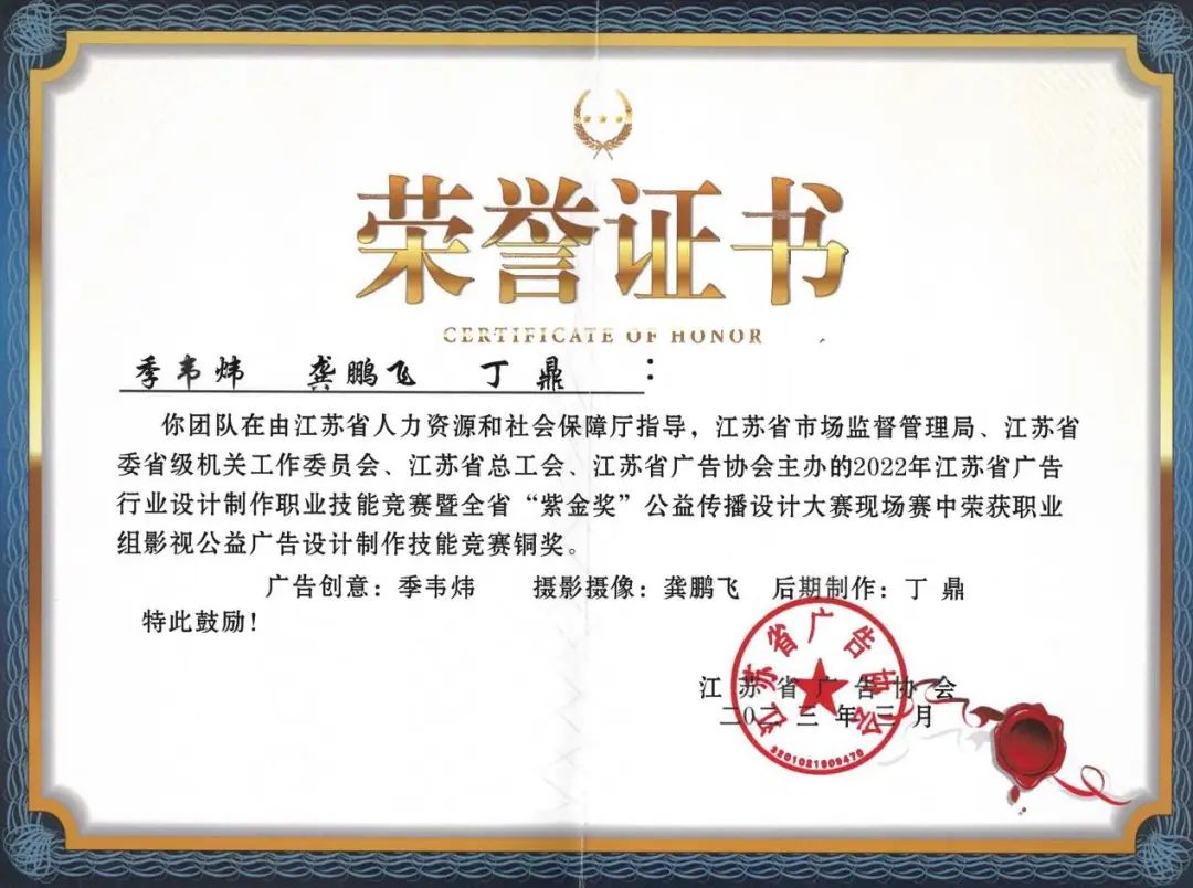 近日,由江蘇省人力資源和社會(huì)保障廳指導(dǎo),江蘇省市場監(jiān)督管理局、江蘇省委省級機(jī)關(guān)工作委員會(huì)、江蘇省總工會(huì)、江蘇省廣告協(xié)會(huì)主辦的2022年江蘇省廣告行業(yè)設(shè)計(jì)制作職業(yè)技能競賽暨全省“紫金獎(jiǎng)”公益?zhèn)鞑ピO(shè)計(jì)大賽在南京圓滿收官。鹽城港文旅集團(tuán)廣告?zhèn)髅椒止緟①悎F(tuán)隊(duì)現(xiàn)場創(chuàng)作的《共圓強(qiáng)國復(fù)興夢》短視頻作品大賽榮獲職業(yè)組影視公益廣告設(shè)計(jì)制作技能競賽銅獎(jiǎng)。