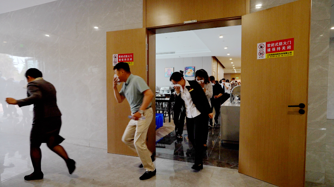 只見(jiàn)滾滾濃煙迅速?gòu)浡_(kāi)來(lái),消防監(jiān)控中心發(fā)現(xiàn)“火情”后,立即按照應(yīng)急預(yù)案行動(dòng)起來(lái)。安保組迅速至火情點(diǎn),進(jìn)行初起火災(zāi)撲救;酒店值班組則通過(guò)廣播等方式通知各樓層人員進(jìn)行疏散;疏散組引導(dǎo)著人們用濕毛巾捂住口鼻,彎腰低姿有序地撤離現(xiàn)場(chǎng)。在疏散過(guò)程中,有人因緊張摔倒,疏散組人員趕緊上前攙扶幫助其安全撤離。整個(gè)演練過(guò)程緊張有序,各個(gè)環(huán)節(jié)緊密銜接。