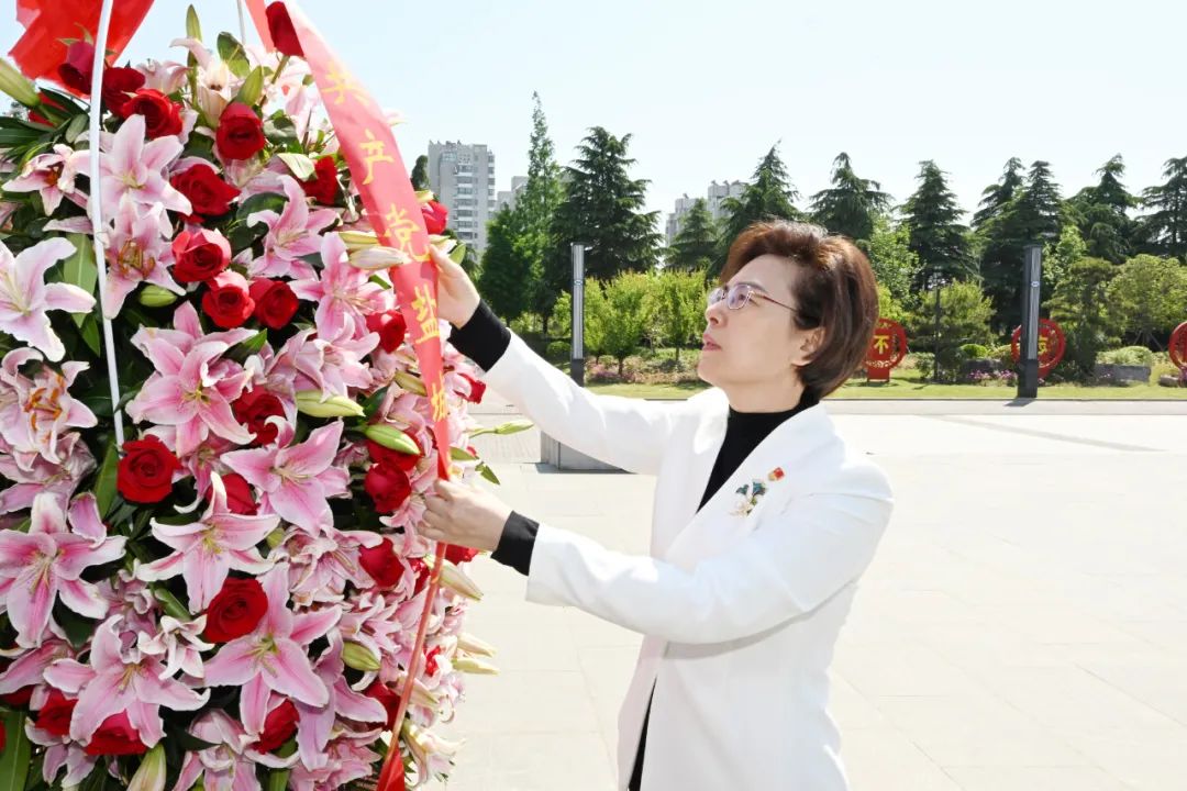 春去夏至,暖陽照耀、藍(lán)天映襯下的新四軍紀(jì)念館莊嚴(yán)肅穆。廣場上,新四軍重建軍部紀(jì)念碑靜靜矗立,守望著鹽城這座英雄之城。徐纓拾級而上登上紀(jì)念碑基座,緩緩走到敬獻(xiàn)的花籃前,仔細(xì)整理花籃緞帶,并同大家一起鞠躬默哀,深切緬懷革命英烈的豐功偉績和崇高精神。
