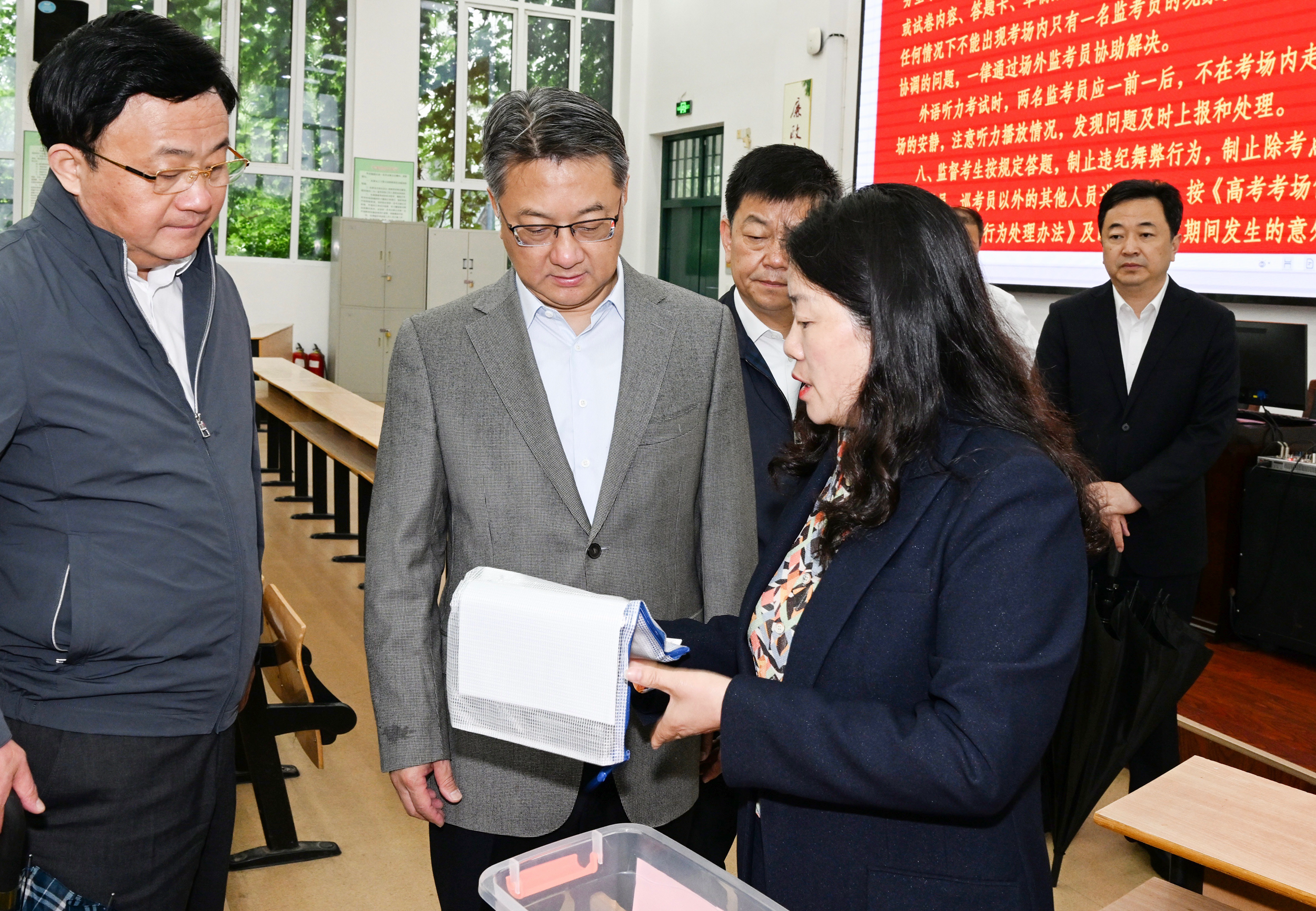 今年全市共設(shè) 8 個考區(qū)、21 個考點(diǎn)、1249 個考場,各項準(zhǔn)備工作已全部就緒。周斌來到亭湖高級中學(xué)考點(diǎn),沿著考生入場線路,認(rèn)真檢查考點(diǎn)準(zhǔn)備工作。他在校門口體驗智能安檢門檢測,走進(jìn)考場仔細(xì)察看考生桌椅擺布,肯定學(xué)校硬件設(shè)施和良好的考試環(huán)境。在考點(diǎn)監(jiān)控室、考務(wù)室,周斌檢查監(jiān)控設(shè)備運(yùn)行等情況,了解監(jiān)考流程規(guī)范等,要求對考務(wù)、后勤等工作再梳理、再檢查,細(xì)而又細(xì)抓好每個環(huán)節(jié),嚴(yán)肅考風(fēng)考紀(jì),確保高考公平公正,為國家選拔棟梁之才。來到市招生考試中心,周斌詳細(xì)了解試卷安全保密、運(yùn)輸保障和各考區(qū)指揮調(diào)度等工作,叮囑各責(zé)任部門單位堅決執(zhí)行考務(wù)工作規(guī)定,壓緊壓實責(zé)任鏈條,完善應(yīng)急預(yù)案,確保高考工作萬無一失。