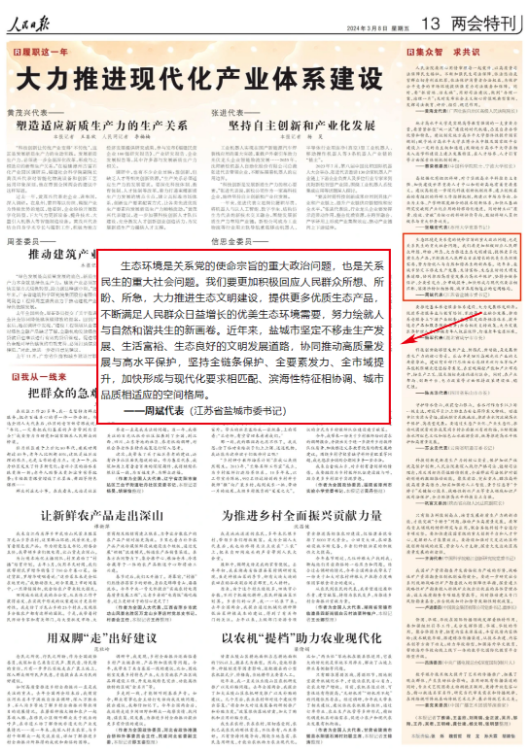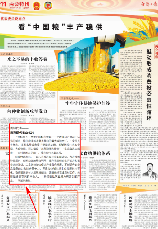 “鹽城是長三角中心區(qū)城市中唯一一個農(nóng)業(yè)總產(chǎn)值超千億元的城市,穩(wěn)住農(nóng)業(yè)基本盤是我們的重大政治責任?!比珖舜蟠怼⒔K省鹽城市委書記周斌表示,鹽城將踐行大農(nóng)業(yè)觀、大食物觀,努力建設“東部沿海大糧倉”“生態(tài)食品大超市”“鄉(xiāng)村休閑大花園”,擦亮現(xiàn)代農(nóng)業(yè)名片。