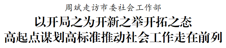 組建黨委社會工作部,是以習(xí)近平同志為核心的黨中央堅(jiān)持和加強(qiáng)黨的全面領(lǐng)導(dǎo)、推進(jìn)國家治理體系和治理能力現(xiàn)代化的重大舉措。市委堅(jiān)決貫徹落實(shí)黨中央和省委決策部署,組建成立社會工作部。走訪中,周斌察看市委社會工作部辦公環(huán)境,與工作人員深入交流,了解大家崗位職責(zé)以及工作磨合情況,鼓勵要切實(shí)增強(qiáng)責(zé)任感、使命感、榮譽(yù)感,圍繞機(jī)構(gòu)職能履職盡責(zé),相互配合、促進(jìn)融合、做好聯(lián)動,在新征程上展現(xiàn)新氣象、體現(xiàn)新?lián)?dāng)、作出新貢獻(xiàn)。