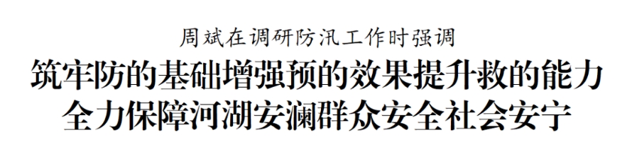 5月15日下午,市委書記周斌調(diào)研防汛工作。他強調(diào),要深入學(xué)習(xí)貫徹習(xí)近平總書記關(guān)于防汛救災(zāi)工作的重要講話重要指示精神,認(rèn)真落實全國和全省防汛抗旱工作電視電話會議部署要求,堅持人民至上、生命至上,強化底線意識、極限思維,以“時時放心不下”的責(zé)任感和“事事心中有底”的行動力,做好應(yīng)對極端天氣的充足準(zhǔn)備,織密筑牢嚴(yán)密防線,全力保障我市河湖安瀾、群眾安全、社會安寧。