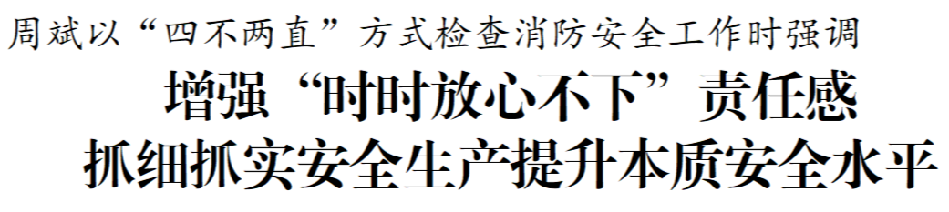6月27日下午,市委書記周斌以“四不兩直”方式檢查消防安全工作。他強(qiáng)調(diào),要深入學(xué)習(xí)貫徹習(xí)近平總書記關(guān)于安全生產(chǎn)和消防工作的重要論述,按照省市委部署要求,時(shí)刻繃緊安全生產(chǎn)這根弦,增強(qiáng)“時(shí)時(shí)放心不下”的責(zé)任感和“事事心中有底”的行動(dòng)力,抓實(shí)抓細(xì)隱患排查整治,壓緊壓實(shí)各方責(zé)任,全面筑牢安全防線,切實(shí)維護(hù)人民群眾生命財(cái)產(chǎn)安全。