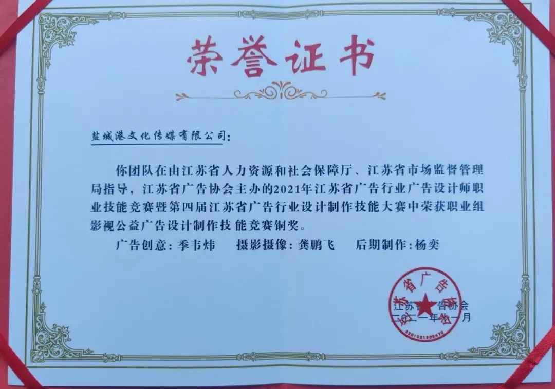 11月28日,從2021年江蘇省廣告行業(yè)廣告設(shè)計師職業(yè)技能競賽暨第四屆設(shè)計制作技能大賽上傳來好消息,由江蘇鹽城港文化傳媒有限公司選送的參賽選手,經(jīng)過現(xiàn)場理論、實際創(chuàng)作等環(huán)節(jié)的比拼,在此次省級一類大賽中分別獲得職業(yè)組平面公益廣告設(shè)計銅獎、職業(yè)組影視公益廣告設(shè)計制作銅獎,為公司進(jìn)一步提升品牌影響力增添了濃墨重彩的一筆,為“50天大比武活動”交上了一份優(yōu)異的答卷。