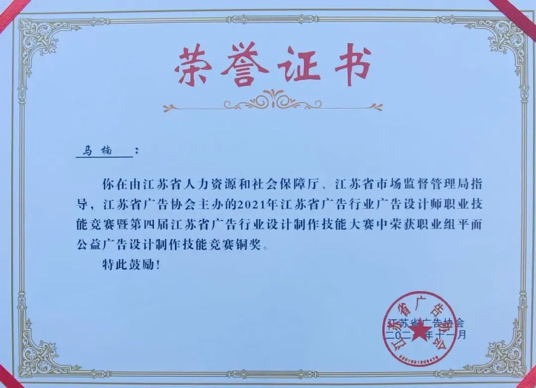 此次大賽是第四屆江蘇省百萬技能人才技能競賽崗位練兵活動其中一項重要賽事,由江蘇省人力資源和社會保障局、江蘇省市場監(jiān)督管理局、江蘇省廣告協(xié)會聯(lián)合舉辦,以“永遠(yuǎn)跟黨走”競賽主題,內(nèi)容包含廣告專業(yè)理論知識考試和技能實操競賽,來自全省各市區(qū)130多支代表隊參加角逐。其中,文化傳媒公司5名參賽選手在理論知識考試和技能實操競賽成績中取得優(yōu)異成績,均獲得三級廣告設(shè)計師職業(yè)技能等級證書。
