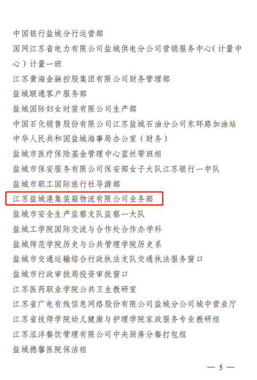 近日,市總工會(huì)發(fā)布《關(guān)于表?yè)P(yáng)鹽城市女職工先進(jìn)集體和先進(jìn)個(gè)人的決定》,袁欣同志、江蘇鹽城港集裝箱物流有限公司業(yè)務(wù)部,分別獲得“鹽城市五一巾幗標(biāo)兵”“鹽城市五一巾幗標(biāo)兵崗”榮譽(yù)稱號(hào)。
