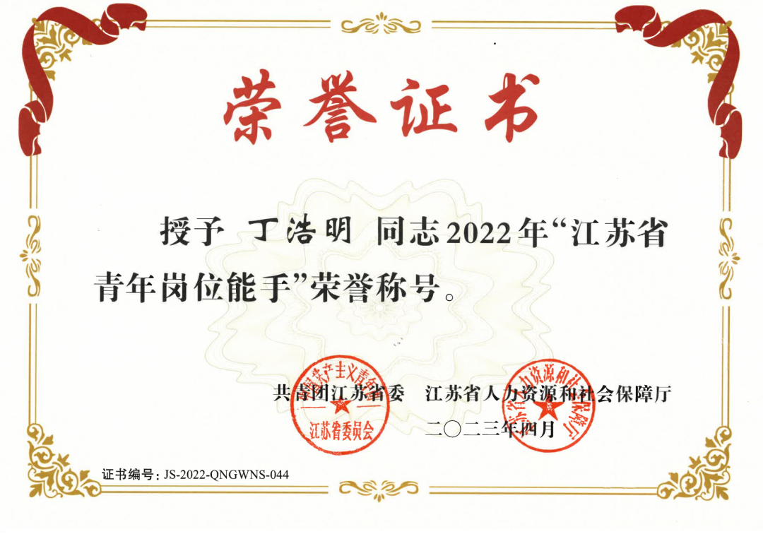 近日,共青團江蘇省委發(fā)布《關于公布2022年江蘇?。ń艹觯┣嗄陯徫荒苁终J定結果的通知》,我集團丁浩明同志榮獲“江蘇省青年崗位能手”榮譽稱號。